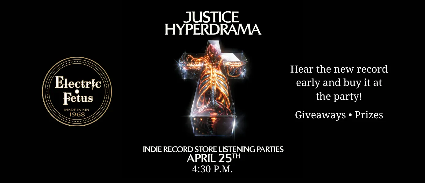 Thursday, April 25th at 4:30 p.m., join us for a listening party to hear the forthcoming Justice release, Hyperdrama! We’ll play the record in its entirety AND you'll be able to purchase the vinyl or CD a day early at the party.